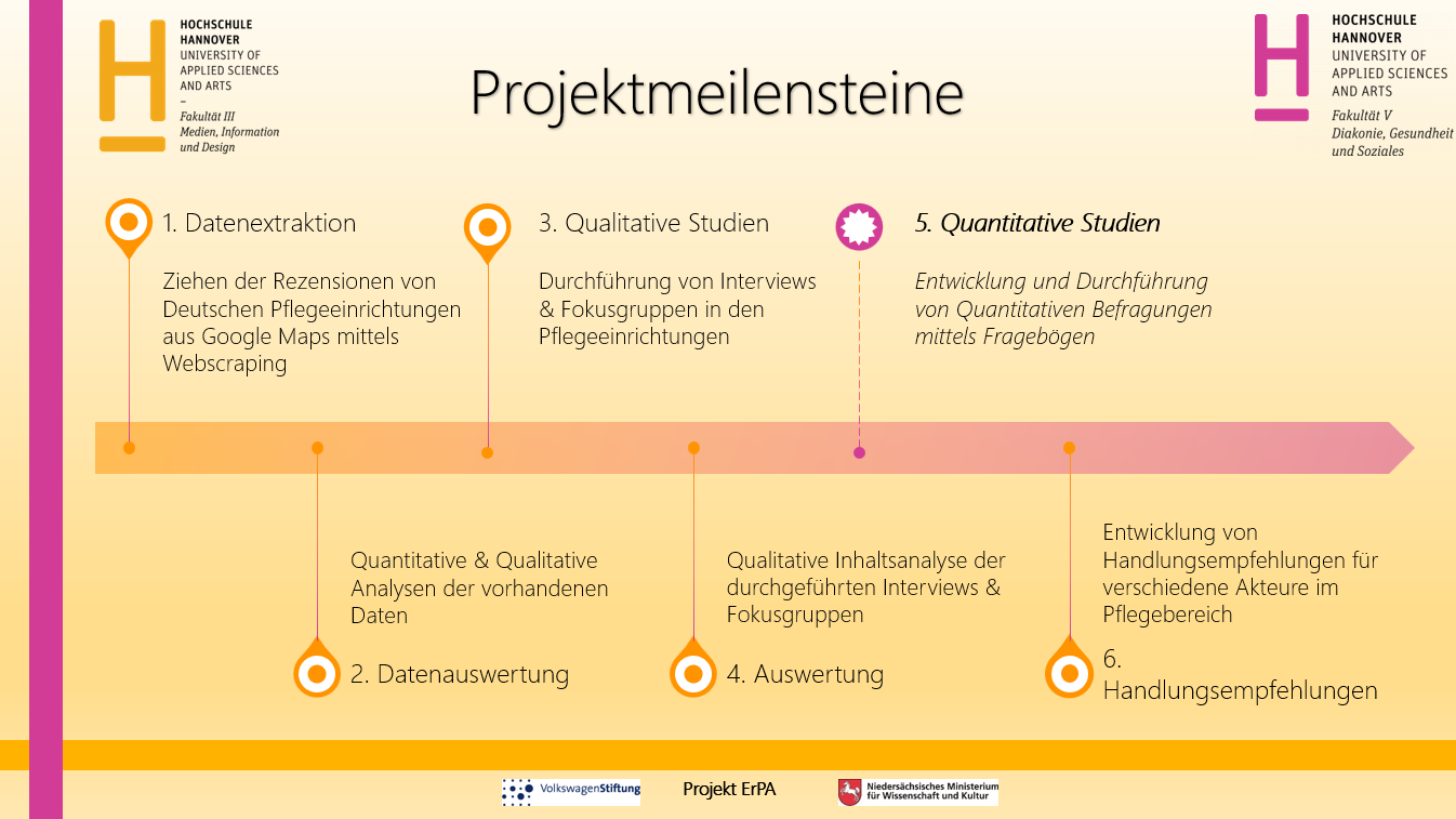 Wie im Projektzeitstrahl zu sehen ist, befinden wir uns derzeit in der fünften Phase des Projekts. In dieser Phase stehen die quantitativen Studien im Mittelpunkt. Dafür werden Fragebögen in Pflegeeinrichtungen eingesetzt.